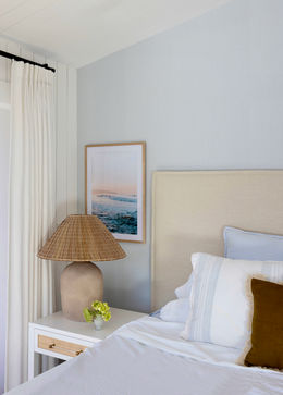 When selecting materials, we opted for a juxtaposition of shimmery and matte, sophisticated and rustic, dramatic and airy. Complete with splashes of woven teal grass cloth wallpaper in the front entry and dining room, roughly hewn organic wood cabinetry in the kitchen and handmade, organic tile in the primary bath. We intentionally chose materials with elevated quality and a sense of organic, handmade character. The combination of materials and style in this home feels sophisticated yet comfortable and decidedly unfussy. The end result is a truly luxuriously casual beachfront living.